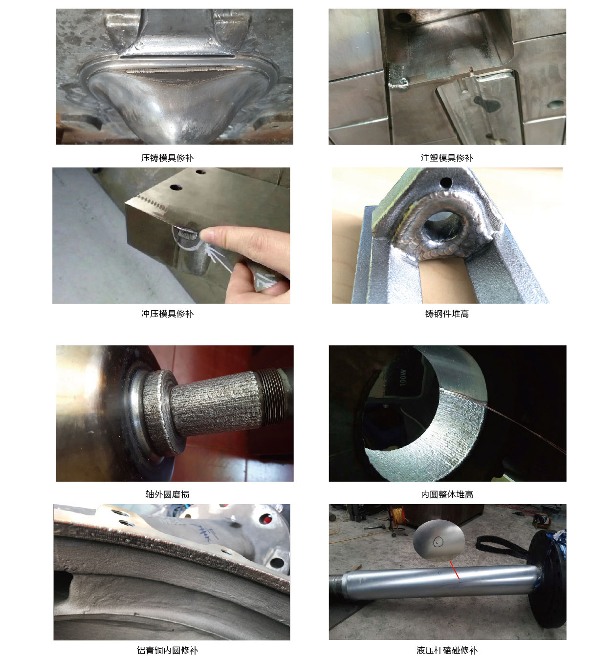 2、工零配件焊補:各類軸類、齒類、液壓桿、油缸、機床軌道的焊補。